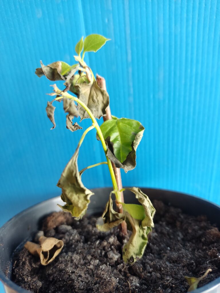 Kiszáradóban lévő bougainvillea csemete, januárban. Ez még nem a vég. Innen még felépül, ha vízhez jut.